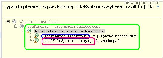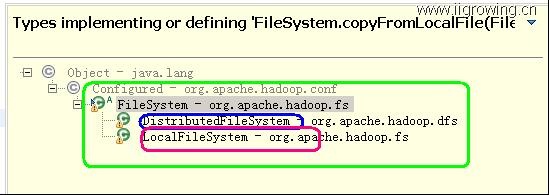 fs.copyFromLocalFile(src, new File(dstf));// 本篇文档中的研究的对象,读者需要将鼠标光标移动这个“copyFromLocalFile”上面,然后按下ctrl+T,然后会弹出相关对话框,选择分布式的一项,如下面两幅图像