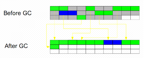 增量收集的方式在理论上可以解决传统分代方式带来的问题。增量收集把对堆空间划分成一系列内存块,使用时,先使用其中一部分(不会全部用完),垃圾收集时把之前用掉的部分中的存活对象再放到后面没有用的空间中,这样可以实现一直边使用边收集的效果,避免了传统分代方式整个使用完了再暂停的回收的情况。