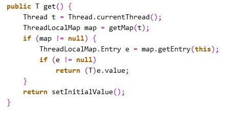 因为在上面的代码分析过程中,我们发现如果没有先set的话,即在map中查找不到对应的存储,则会通过调用setInitialValue方法返回i,而在setInitialValue方法中,有一个语句是T value = initialValue(), 而默认情况下,initialValue方法返回的是null。