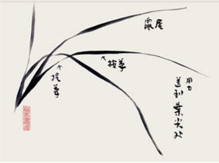 画兰以叶为先,起首一笔,有钉头、鼠尾、螳螂肚之法。二笔交凤眼,三笔破凤眼,四笔、五笔宜间折叶。